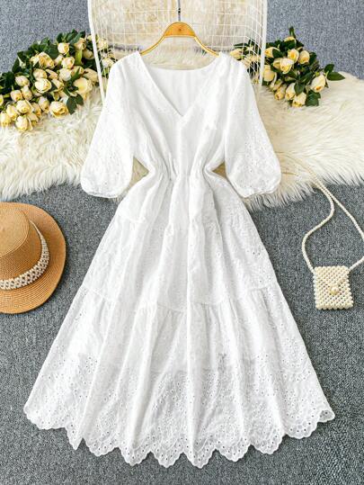 SHEIN Unity 大码浪漫优雅纯色 V 领纹理荷叶边高腰蛋糕中长连衣裙 - 白色 - 查看 1
