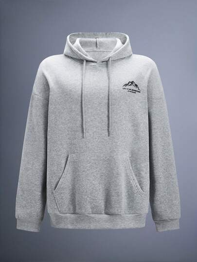 Driftmere 男士秋冬简约山景印花口袋抽绳连帽卫衣,长袖上衣 - 灰色 - 查看 1