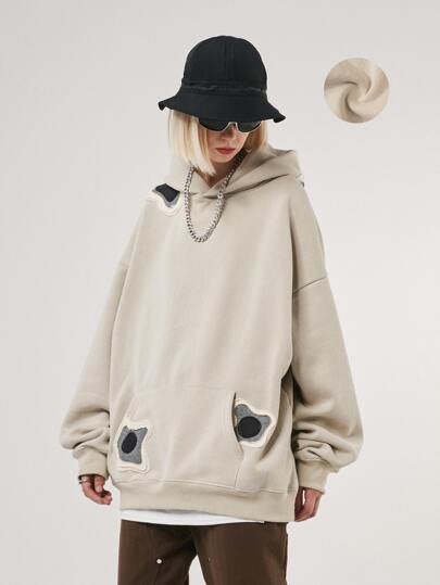 落肩袖補丁細節連帽衫 - 卡其色 - 查看 1