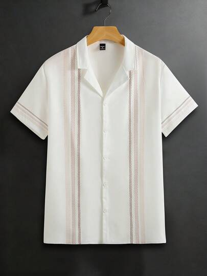 EGENSIO 男士西装领单排扣条纹休闲通勤短袖衬衫 - 白色 - 查看 1