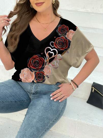 EMERY ROSE 休闲简约心形与玫瑰图案 V 领短袖修身大码女式 T 恤,适合夏季