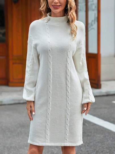 EMERY ROSE 小高領落肩袖麻花編織毛衣洋裝 - 白色 - 查看 1