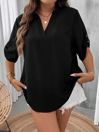 SHEIN LUNE 大碼捲邊袖補丁貼口袋襯衫 - 黑色 - 查看 1
