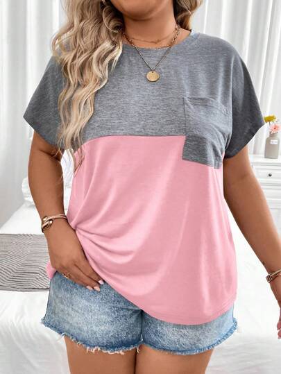 EMERY ROSE 大码夏季休闲拼色蝙蝠袖 T 恤图案 T 恤女式上衣 - 粉色 - 查看 1