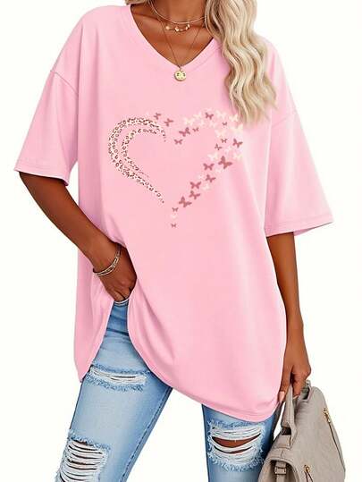 EMERY ROSE 来自欧美的春夏流行女式V领短袖宽松爱心T恤上衣。