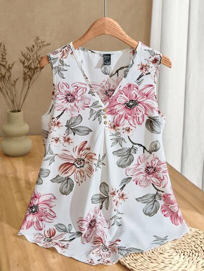 Rusticease 夏季休闲褶饰纽扣不对称下摆花朵印花背心 - 彩色 - 查看 1