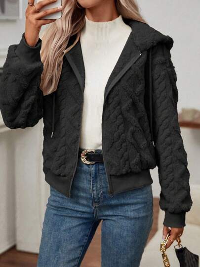 EMERY ROSE 女式黑色紋理毛絨連帽夾克 - 黑色 - 查看 1