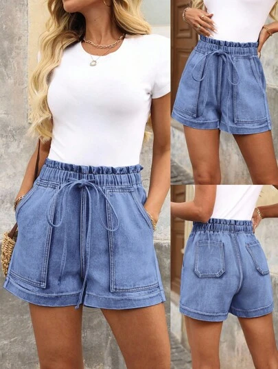 EMERY ROSE 女士抽绳腰口袋阔腿宽松休闲牛仔短裤 - 淺色水洗藍 - 查看 1