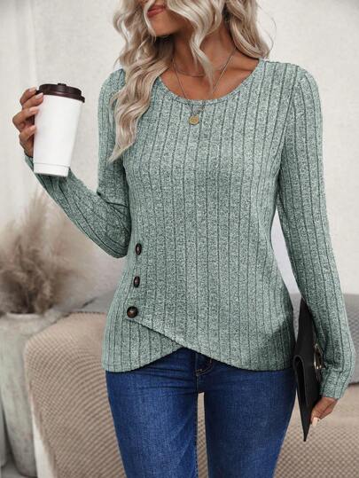 EMERY ROSE 女士纯色简约休闲圆领长袖纽扣 T 恤 - 綠色 - 查看 1