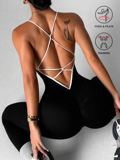 Easithlete 女士无缝交叉扭结带连体运动服 - 黑與白 - 查看 1