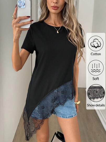 Easowa 女士黑色圆领短袖T恤,蕾丝下摆不对称设计,纯棉材质,春夏款 - 黑色 - 查看 1