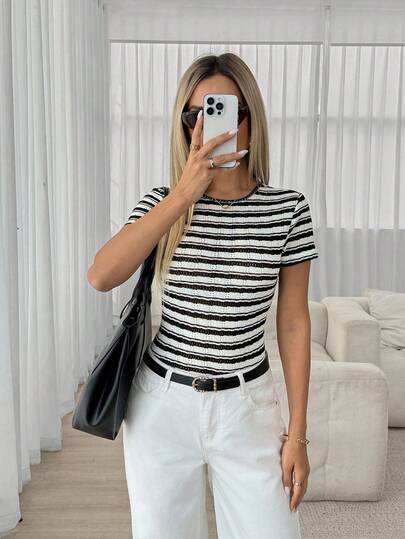 Easowa 女士圆领修身罗纹T恤,纹理面料,休闲优雅,适合外出和居家穿着 - 彩色 - 查看 7