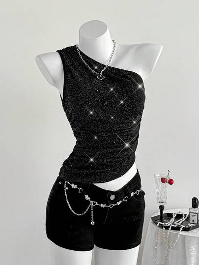 Elamini 女士黑色针织亮片面料不对称领斜肩褶裥腰身不对称下摆衬衫,优雅百搭,适合春夏通勤、派对、复古风、约会、日常穿着。 - 黑色 - 查看 1