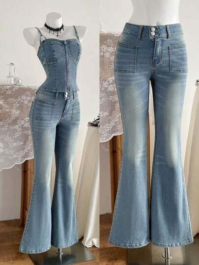 Elamini 女士休闲通勤水洗喇叭牛仔裤 - 藍色 - 查看 1