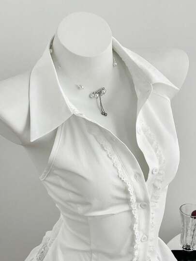 Elamini 女士翻领无袖蕾丝拼接A字娃娃衫,春夏款 - 白色 - 查看 1