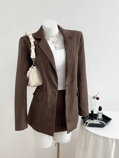 Elamini 女士优雅套装,休闲棕色条纹西装外套搭配同色系棕色条纹迷你裙两件套,适合秋冬季日常穿着。 - 彩色 - 查看 1