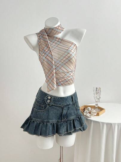 Elamini 女士时尚牛仔裙,带口袋和荷叶边下摆 - 中等水洗藍 - 查看 1