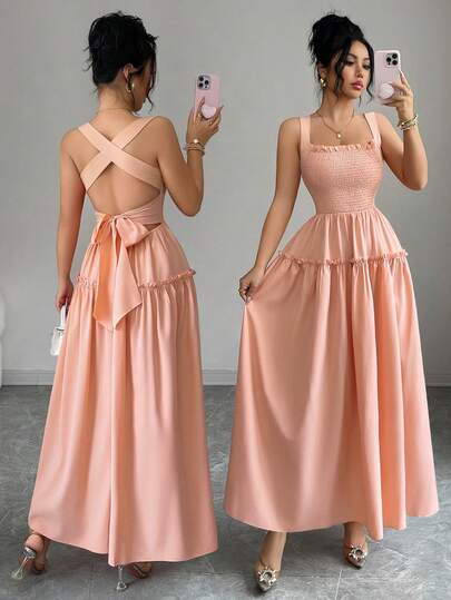 Elenzga 新款露背系带修身优雅性感百搭女式长裙 - 粉色 - 查看 6