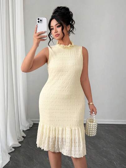Elenzga 大码无袖泡泡针织修身优雅春夏连衣裙 - 杏色 - 查看 1