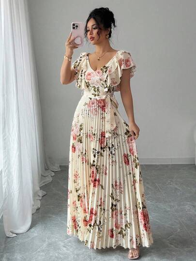 Elenzga V 领数码花卉印花度假荷叶边腰 A 字型优雅浪漫女式连衣裙 - 彩色 - 查看 6