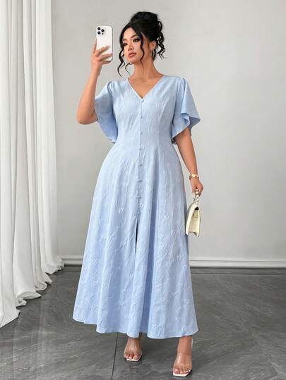 Elenzga 女士优雅通勤休闲蓝色提花V领不规则荷叶边装饰纽扣收腰显瘦加大码长款连衣裙,春夏款 - 天藍色 - 查看 1