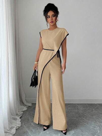 Elenzga 女士优雅通勤撞色修身连体裤 - 卡其色 - 查看 5