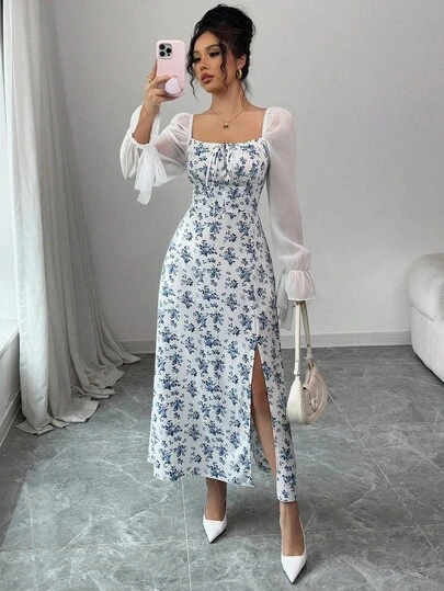 Elenzga 女士网眼拼布长袖开衩休闲长裙