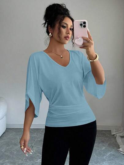 Elenzga 女式纯色中袖收腰褶饰蝙蝠袖V领短袖T恤