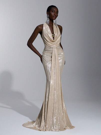 Elitara 优雅、浪漫、性感、极简、浅桃色、有弹性、露肩、露背、紧身、低胸、鱼尾下摆、拖尾、时尚、网红、节日、假日、生日派对、婚礼活动、伴娘礼服 - 杏色 - 查看 7