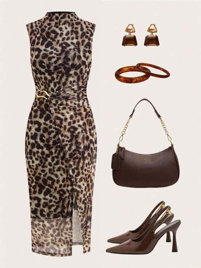 Ellevyn 女士豹纹无袖中长连衣裙 - 咖啡棕 - 查看 1