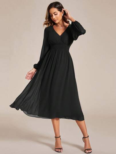 优雅褶皱长袖收腰雪纺黑色伴娘礼服婚礼宾客礼服 - 黑色 - 查看 1