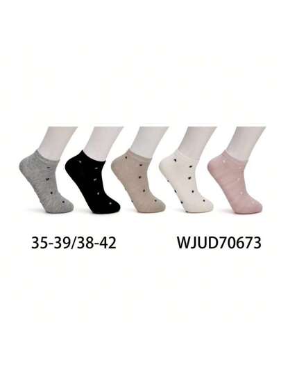 5双高品质100%纯棉弹力纯色心形系列踝袜,舒适贴合,不臭脚。颜色:粉色、浅黄色、卡其色、黑色、灰色。注意:由于每台显示器存在色差,实际产品可能存在差异。尺码随机,但弹性很好,适合3.5-4.2码的日常穿着。 - 彩色 - 查看 1