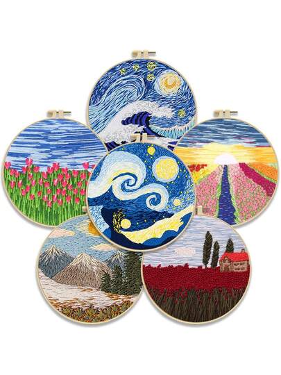 刺绣入门套件 - 山脉与花卉风景 DIY 工艺套件(11ct 布料、3 股线、全套工具),适用于枕头、悬挂装饰、家居装饰,包含初学者视频教程 - 彩色 - 查看 9