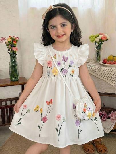 Emery Rose Kids 买一送一两件套,包含一个免费斜挎包。可爱少女编织刺绣圆领荷叶边连衣裙,搭配斜挎包,姐妹装,适合春夏穿着。