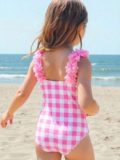 Emery Rose Kids Emery Rose Kids 女童格子3D花卉边饰泳衣,春夏款 - 淺粉色 - 查看 3