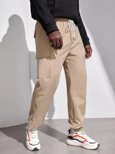 Manfinity 男士腰部抽繩側翻蓋口袋工裝褲 - 卡其色 - 查看 1