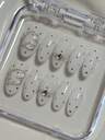 清凉甜美的夏日美甲,10款短椭圆形压片美甲。图案以纯净通透的白色为主,点缀银线、星星、小钢珠等,闪耀夺目。更有立体的白色翅膀和可爱的蝴蝶结,优雅可爱,提升整体造型的美感和精致感。可重复使用。美甲用品 美甲