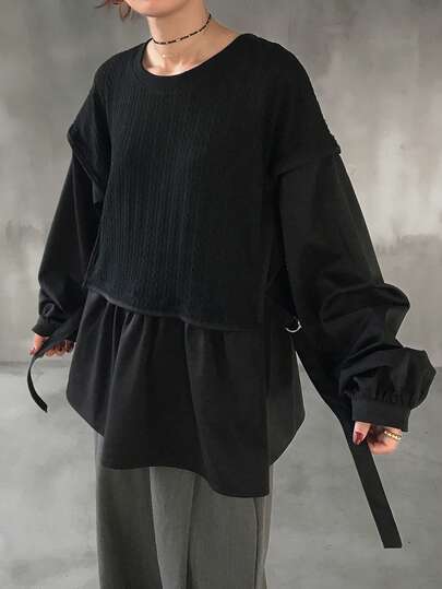FRIFUL 女士休闲二合一长袖T恤,秋季款 - 黑色 - 查看 1
