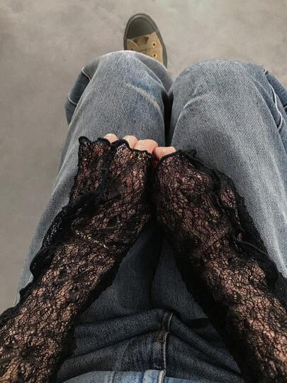 FRIFUL 女士修身蕾丝衬衫,圆领长袖,透明纹理面料,休闲百搭,适合度假、海滩 - 黑色 - 查看 5