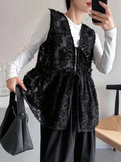 FRIFUL 女士V领纹理宽松无袖背心外套黑色背心女款黑色背心黑色系带背心薄纱黑色背心背心上衣女式外套 - 黑色 - 查看 1