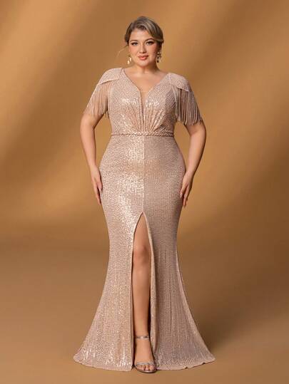 Faeriesty Mosy Plus 新娘母亲礼服:优雅亮片深V领美人鱼晚礼服,肩部饰有流苏 - 前开叉鱼尾裙,适合婚礼、庆典、红毯活动 - 香檳色 - 查看 1