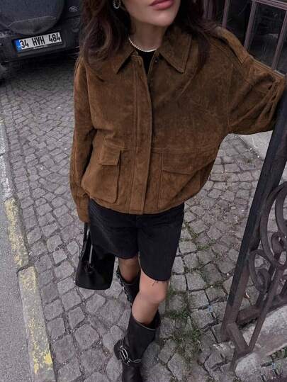 秋冬飞行员夹克女士外套麂皮夹克女士街头服饰假日女士大衣拉链新款大衣 - 咖啡棕 - 查看 1