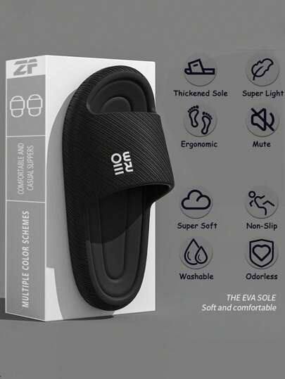 秋冬新款时尚柔软黑色斜纹厚底字母图案EVA材质静音耐磨防滑透气浴室男士居家拖鞋 - 黑色 - 查看 1