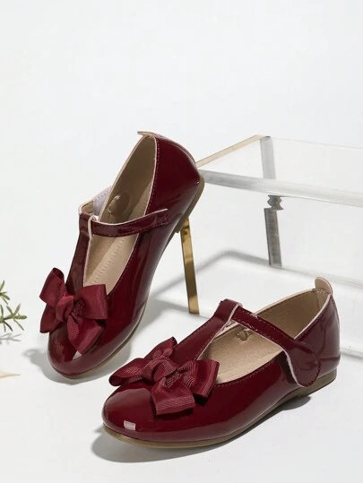 秋冬復古休閒女孩單鞋,大孩子們可愛蝴蝶結裝飾公主表現平底鞋 - 酒紅色 - 查看 1
