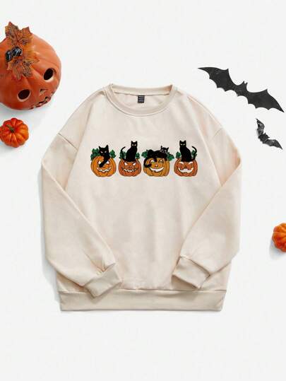 SHEIN Unity 女士圆领长袖休闲南瓜和黑猫图案印花宽松套头衫万圣节运动衫 - 米色 - 查看 1