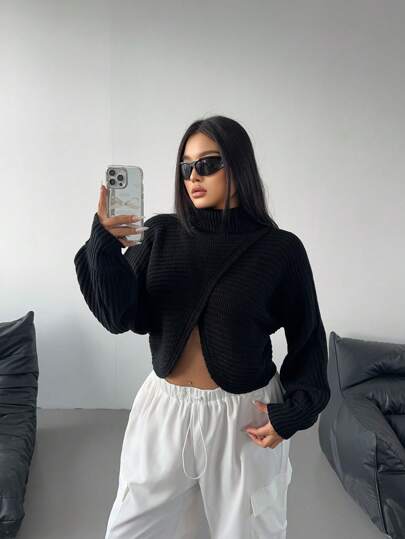 Flirla 大码时尚俏皮高领短款长袖修身针织套头衫,秋冬款 - 黑色 - 查看 1