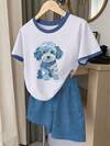 两件套少女T恤短裤套装,可爱蓝色小狗牛仔印花短袖T恤,休闲牛仔印花短裤,适合外出、春、夏、秋季、日常百搭,白色短袖T恤,适合13-16岁女孩