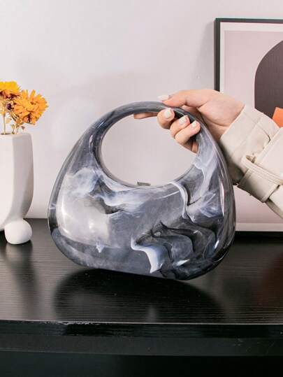 時尚漸變染圓形晚餐包,設有環形和新月裝飾,可手持或斜挎,搭配多用途金屬鏈肩帶,適用於派對和活動 - 黑與白 - 查看 4