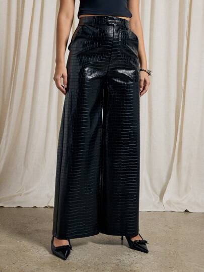 AiiRZ 仿鳄鱼皮定制阔腿裤 - 黑色 - 查看 5