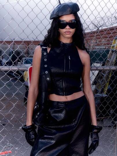 MUSERA 仿皮高领拉链露背赛车服式上衣,适合秋冬季街头风,清凉时尚,适合夜间外出、日常穿着,性感优雅,适合假日、派对、夏季和春季穿着。 - 黑色 - 查看 7